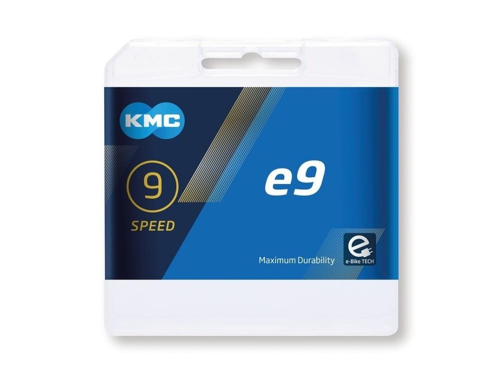 9rychlostní řetěz KMC e9 Silver se 122 články, vhodný pro elektrokola.