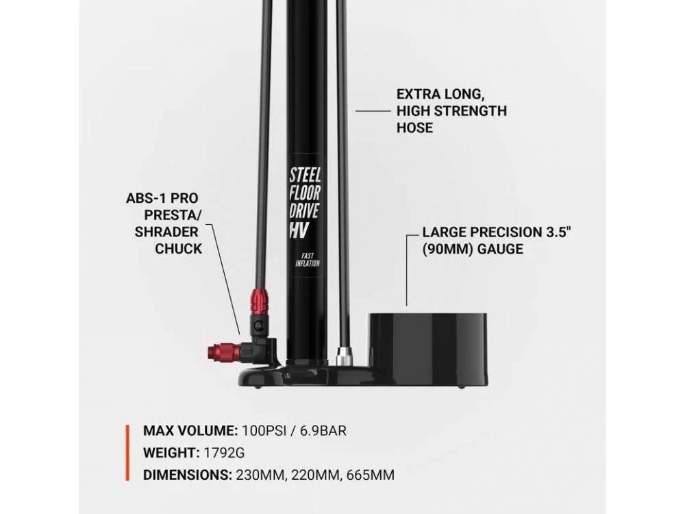 Zaprojektowana z myślą o wysokiej wydajności i długotrwałej trwałości - Steel HV Floor Drive 3.5 to wysokiej klasy rowerowa pompka podłogowa z obrobioną maszynowo aluminiową Basil, większą, trwałą stalową lufą i tłokiem przymocowanym do ergonomicznego, lakierowanego drewnianego uchwytu - oferująca o 25% większą objętość powietrza na skok dla szybszego pompowania większych opon. Wyposażona w bardzo dokładny 3,5-calowy manometr do (100psi/6,89bar), wyjątkowo długi, wytrzymały wąż oraz kompatybilny z Presta i Schrader uchwyt A-Power Pro Chuck dla szybkiego, precyzyjnego i osiągalnego pompowania.
